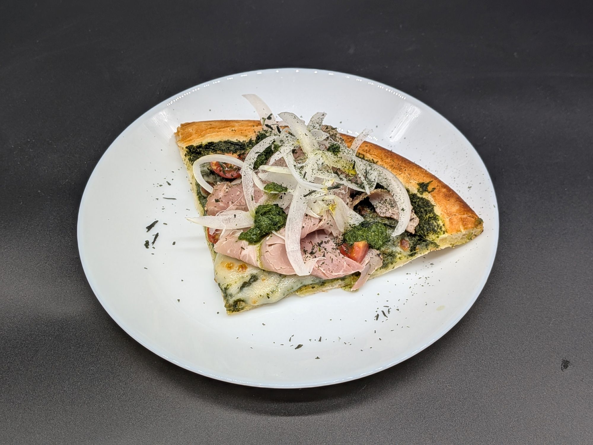 「大和茶ピッツァ」には、奈良県が誇る特産品「大和茶(※)」と「大和ポーク」の自家製ベーコンを使用。香りが高く滋味豊かな大和茶の自家製ジェノベーゼソースと自慢のピッツァのコラボをお楽しみいただける逸品です。