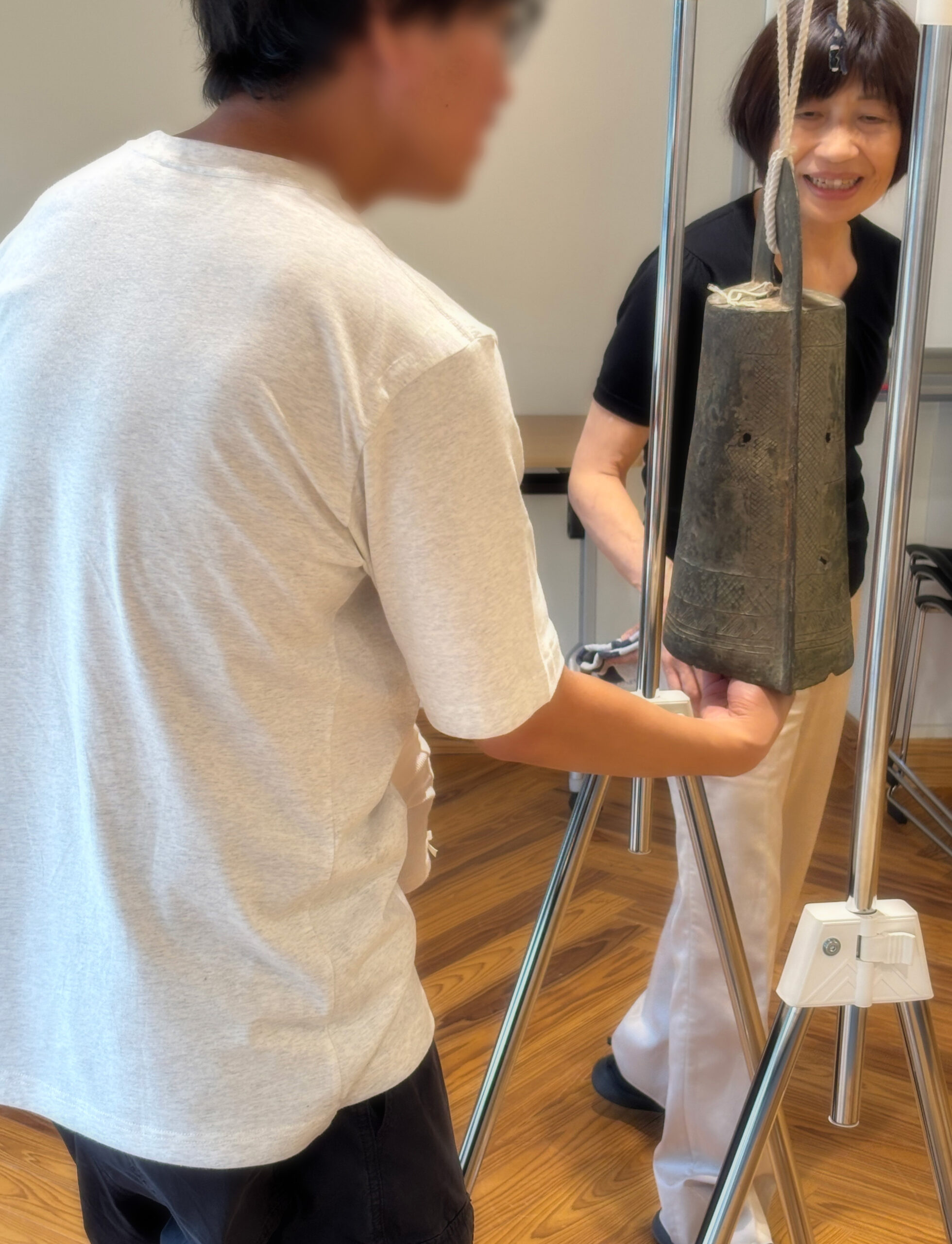 体験:三角縁神獣鏡、海獣葡萄鏡のレプリカに触れる銅鐸のレプリカを鳴らしてみる、石器で鹿の角を切ってみる