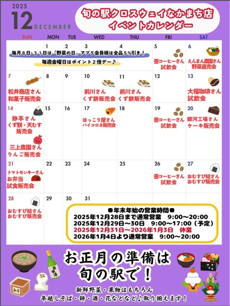 道の駅「クロスウェイなかまち」の農産物・特産品直売所「旬の駅 クロスウェイなかまち店」における旬の情報12月編をお届けします。