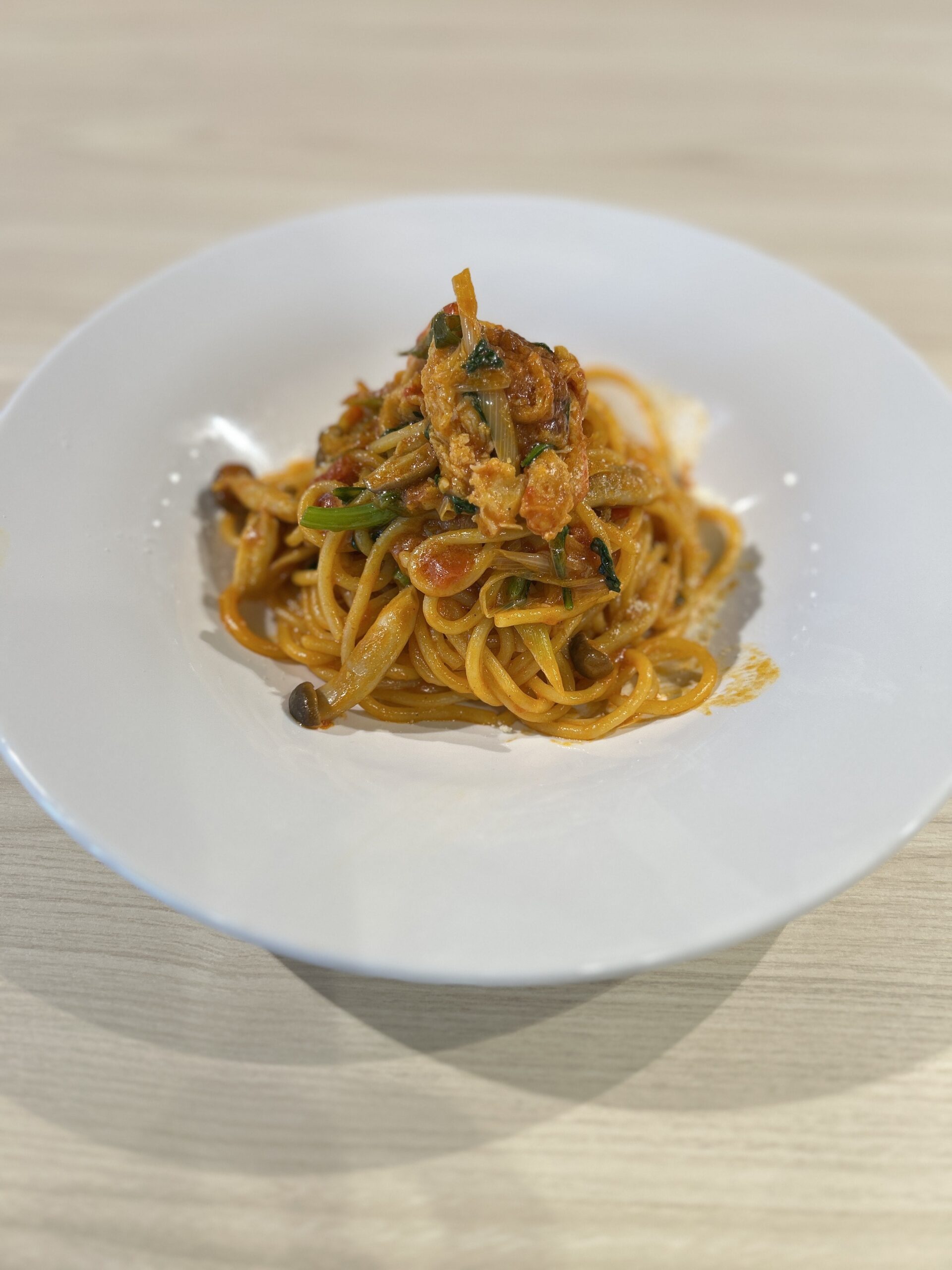 濃厚な蟹の旨味と完熟トマトの甘く爽やかな酸味が絶妙なバランスのコク豊かなクリームパスタをご提供。
