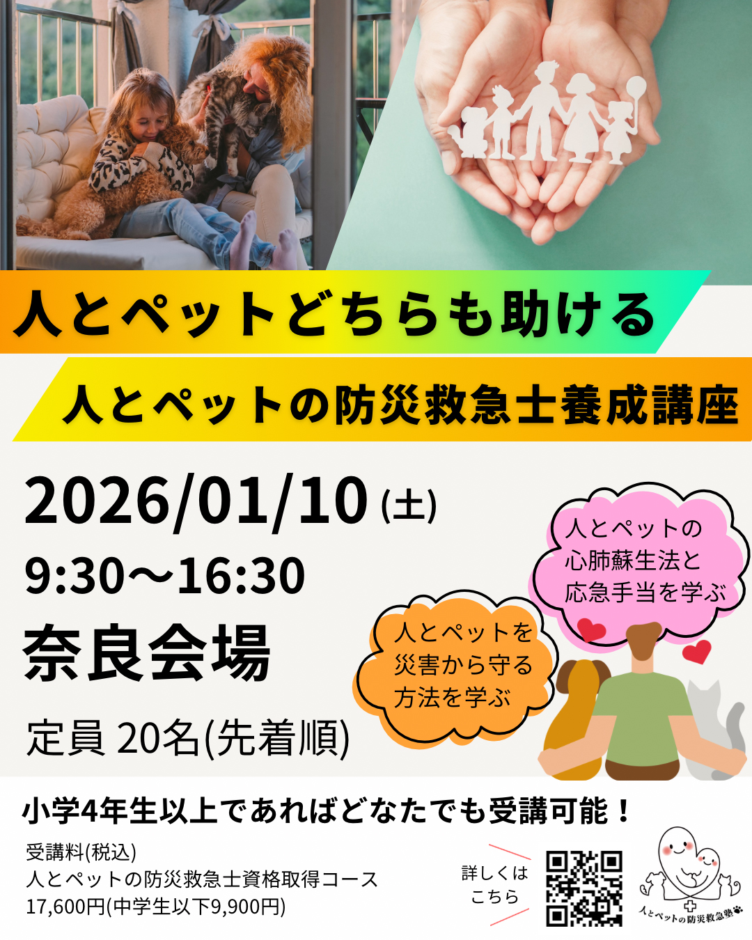 これらのコースを修了し試験に合格すると、「人とペットの防災救急士」の資格を取得できます。