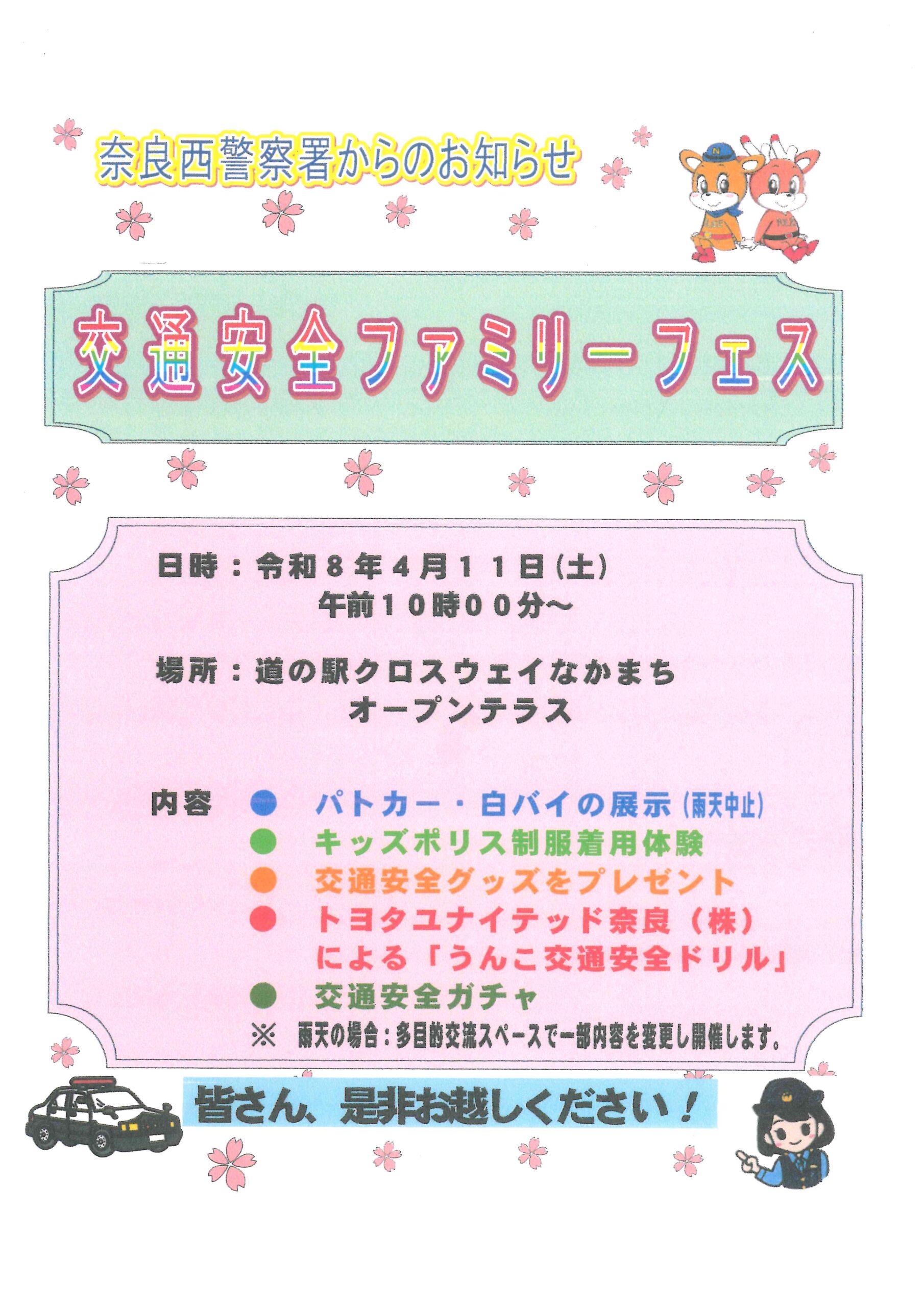 奈良西警察署の主催で、「パトカー・白バイの展示」、「キッズポリス制服着用体験」、「交通安全グッズのプレゼント」などを実施します。